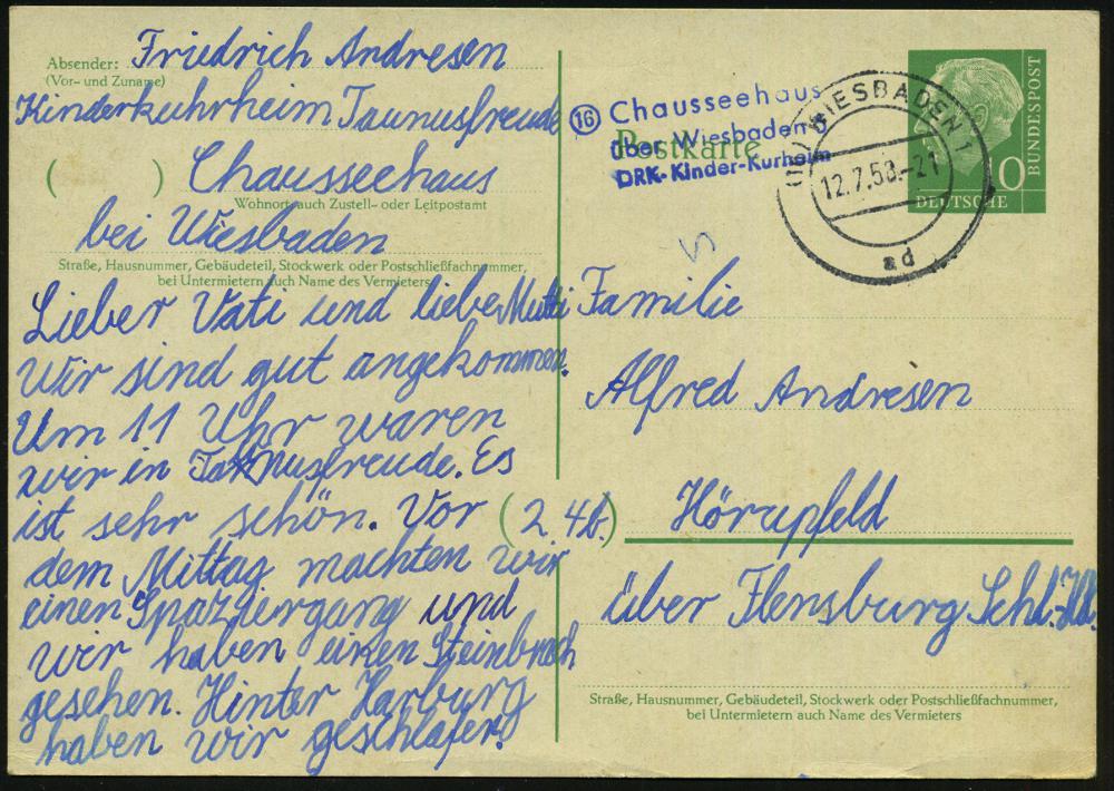 1273 | 20 € | 6200 Wiesbaden Allgem. Belege : (16) WIESBADEN 1/ ad 1958 (12.7.) 2K + seltener blauer 3L: (16) Chausseehaus/über Wiesbaden/ D R K - Kinder-Kurheim = seltene PSt.II = Hauspostamt RK-Kinderheim!, Bedarfskt. eines Kindes | ![]() | |