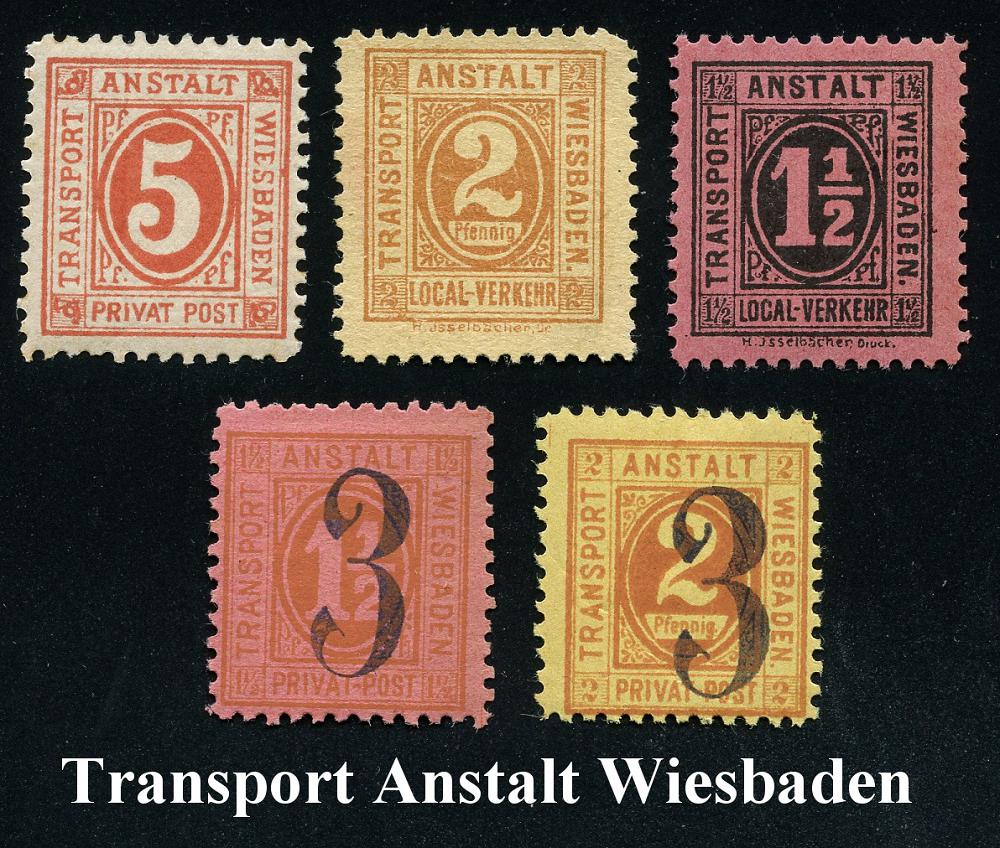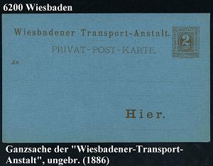 1251 | 18 € | 6200 Wiesbaden Allgem. Belege : Wiesbaden 1886 Privatpost "Wiesbadener Transport-Anstalt", Orts-P 2 Pf. Ziffer, braun/blau , ungebr. | ![]() | |