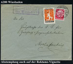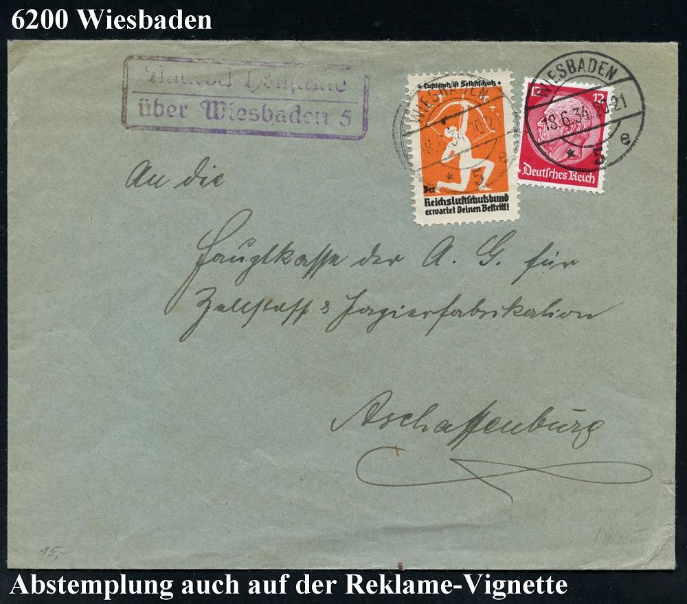 1259 | 25 € | 6200 Wiesbaden Allgem. Belege : WIESBADEN/ *5e 1934 (18.6.) 1K-Brücke auf EF 12 Pf. Hindenbg. + frühe Propaganda-Vignette: Der Reichsluftschutzbund.. = Bogenschütze + viol. Ra.2: = PSt.II, Fern-Bf. (Mi.497) | ![]() | |