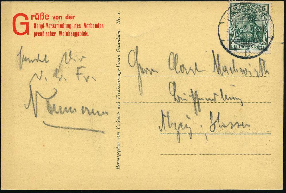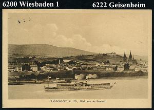1255 | 20 € | 6200 Wiesbaden Allgem. Belege : WIESBADEN/ *5e 1913 (6.9.) 1K-Gitter auf s/w.-Foto-So.Kt.: "Grüße von der Haupt-Versammlung d. Verbandes preuß. Weinbaugebiete" (Geisenheim) Bedarf (Mi.85 I) | ![]() ![]() | |