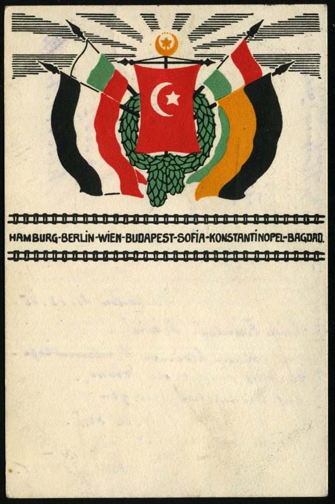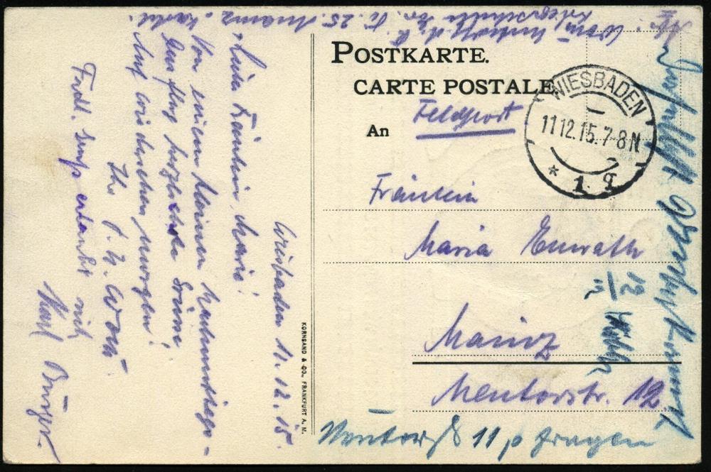 1256 | 16 € | 6200 Wiesbaden Allgem. Belege : WIESBADEN/ *1q 1915 (11.12.) 1K-Brücke + hs. Abs.: "Kriegsschule Ers. Pi. 25 Mainz..", patriot. Color-Propaganda-Ak.: Flaggen der Mittelmächte, Orte der Bagdad-Bahn (Uhv. Kornsand & Co., Frankfurt a.M.) klar gest. Feldpost-Kt. n. Mainz | ![]() ![]() | |