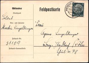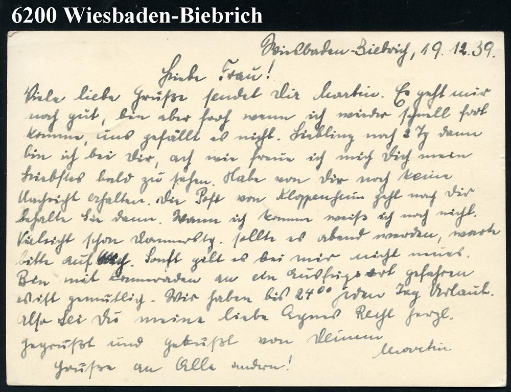 1261 | 18 € | 6200 Wiesbaden Allgem. Belege : WIESBADEN-BIEBRICH/ a 1939 (19.12.) 2K-Steg auf EF 6 Pf. Hindenbg., frankierte Vordr.-Kt. "Feldpostkarte" (o. Druckvermerk) hs. Fp.-Nr. 31109 = Rgt. Stab Lg. Nachr. Rgt. 12, aber ohne Briefstempel, daher noch Frankierzwang n. Berg.Gladbach (Mi.516 EF) | ![]() ![]() | |