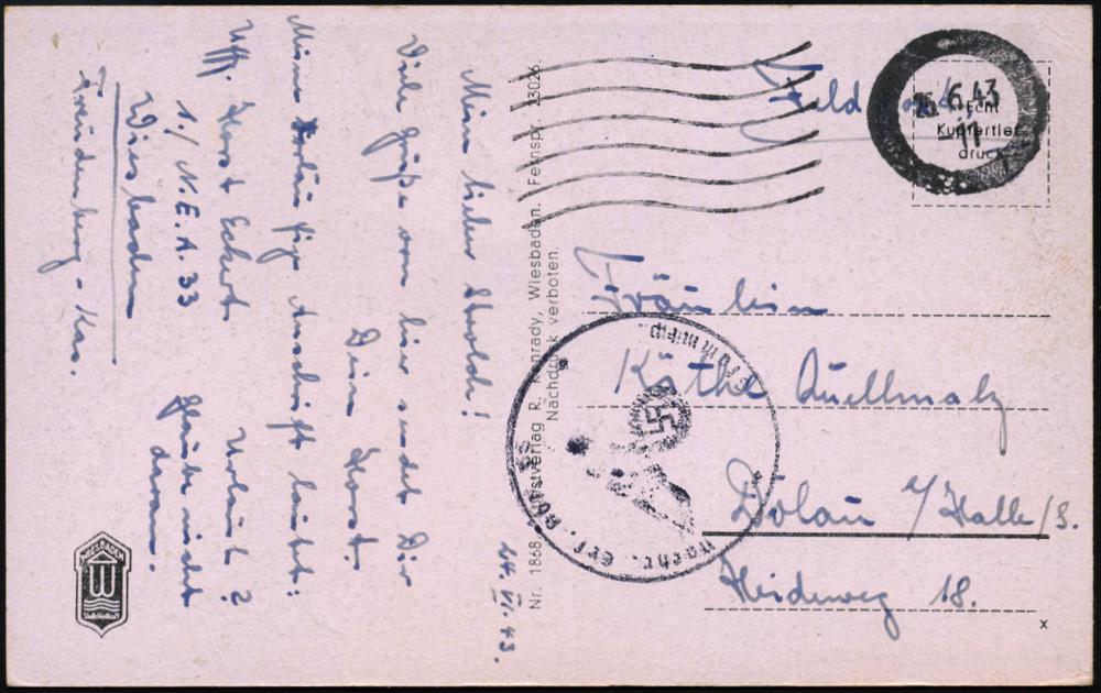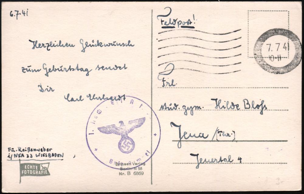 1262 | 15 € | 6200 Wiesbaden Allgem. Belege : Wiesbaden 1941 (7.7.) stummer Ma.WellenSt (abgeschliffen) = Tarnstempel Wiesbaden (Mi.45) + viol. 1K-HdN: 1. Nach (richten). Ers. Abt. + hs. Abs., Feldpost-Glückwunsch-Kt. n. Jena | ![]() | |