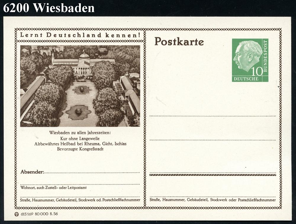 1271 | 8 € | 6200 Wiesbaden Allgem. Belege : Wiesbaden 1956 10 Pf. BiP Heuss I, grün: Heilbad bei Rheuma, Gicht.. (Kurhaus u. Park) ungebr. (Mi.P 24) | ![]() | |