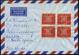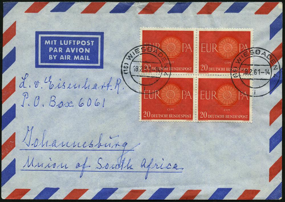 1274 | 16 € | 6200 Wiesbaden Allgem. Belege : (16) WIESBADEB 4/ i 1961 (18.2.) 2K-Steg 2x auf 20 Pf. CEPT Europa, reine MeF: 4er-Block , klar gest. Übersee-Flp.-Bf. n. Südafrika (Mi.338 MeF) | ![]() | |