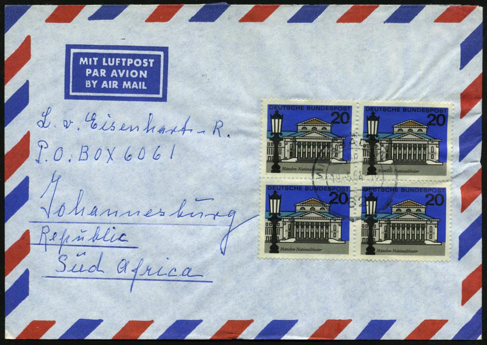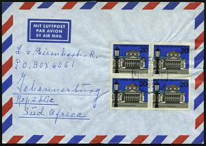 1277 | 15 € | 6200 Wiesbaden Allgem. Belege : 62 WIESBADEN 1/ ab 1964 (19.5.) 1K-Segment zentr. auf 20 Pf. National-Theater München, reine MeF: 4er-Block , klar gest. (Wiesbaden 1) Übersee-Flp.-Bf. n. Südafrika (Mi.419 MeF) | ![]() | |