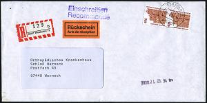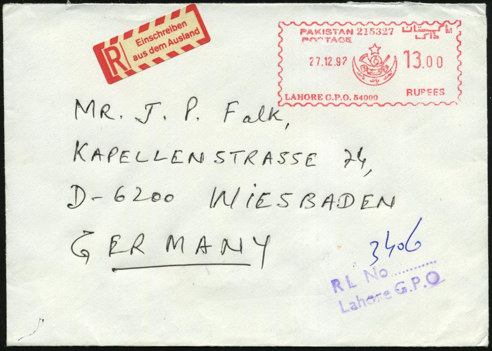 1281 | 18 € | 6200 Wiesbaden Allgem. Belege : Wiesbaden 1992 (27.12.) Selbstklebe-RZ: R/Einschreiben/aus dem Ausland, nachgezettelt in Wiesbaden ,viol. R-Stempel: RL No./Lahore G.P.O. (Pakistan) + AFS: LAHOTE G.P.O. 54000, Übersee-R-Bf. (n. Wiesbaden) | ![]() | |