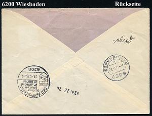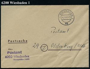 1275 | 12 € | 6200 Wiesbaden Allgem. Belege : WIESBADEN 1/ ag 1962 (6.9.) aptierter 2K-Steg = alte PLGZ entfernt + viol. 3L: Postamt/6200 Wiesbaden.. ,Postdienst-Bf. | ![]() | |