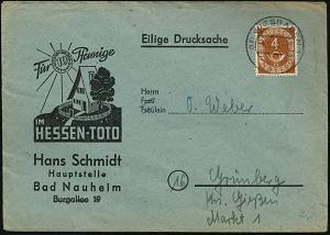 1269 | 12 € | 6200 Wiesbaden Allgem. Belege : (16) WIESBADEN 1 1951 (4.9.) 2K-Steg auf Reklame-Bf.: Für 10 Pfennige IM HESSEN-TOTO/Hans Schmidt.. , Inl.-Reklame-Bf. (Mi.124) | ![]() | |