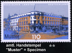 1280 | 28 € | 6200 Wiesbaden Allgem. Belege : B.R.D. 1999 110 Pf. Hessisches Landesparlament, Wiesbaden mit amtl. Handstempel "M u s t e r" , postfr. + amtl. Ankündigungsblatt der Bundesdruckerei (Format A4) 2 Belege kompl.!, selten! (Mi.2030 Muster = Specimen!) | ![]() ![]() | |