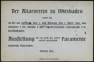 1254 | 20 € | 6200 Wiesbaden Allgem. Belege : WIESBADEN/ *1n 1906 (30.3.) 1K-Gitter auf Orts-P 2 Pf. Germania + rs. Zudruck: Der Altarverein zu Wiesbaden.. Ausstellung.. Paramente , klar gest. Orts-Retour-Kt. (Mi.PZD 63 X) | ![]() ![]() | |