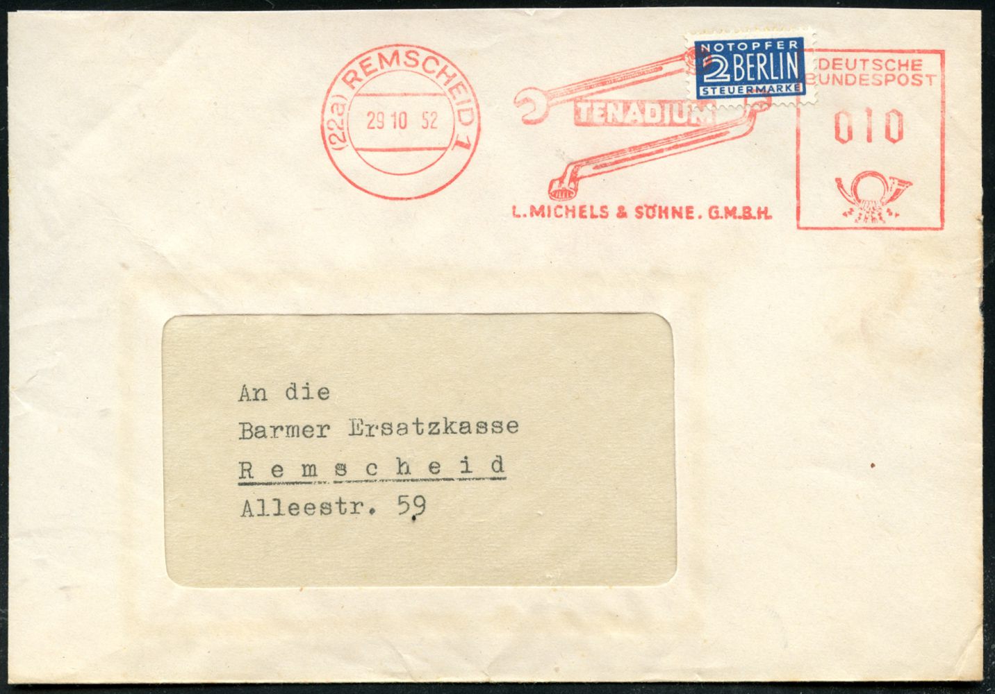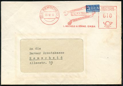 10369 | 15 € | 5630 REMSCHEID : (22a) remscheid 1/ TENADIUM/ L.MICHELS & SÖHNE GMBH 1952 (29.10.) AFS Francotyp (Motiv: 2 Schraubschlüssel) auf 2 Pf. NoB (= Vorausentwertung) Orts-Bf. (Dü.E-23CGo) | ![]() | |