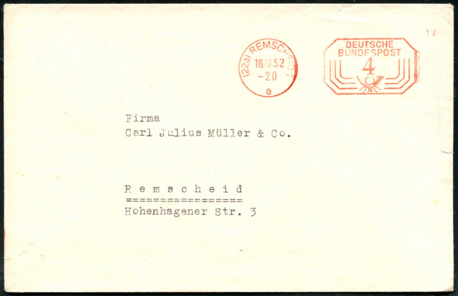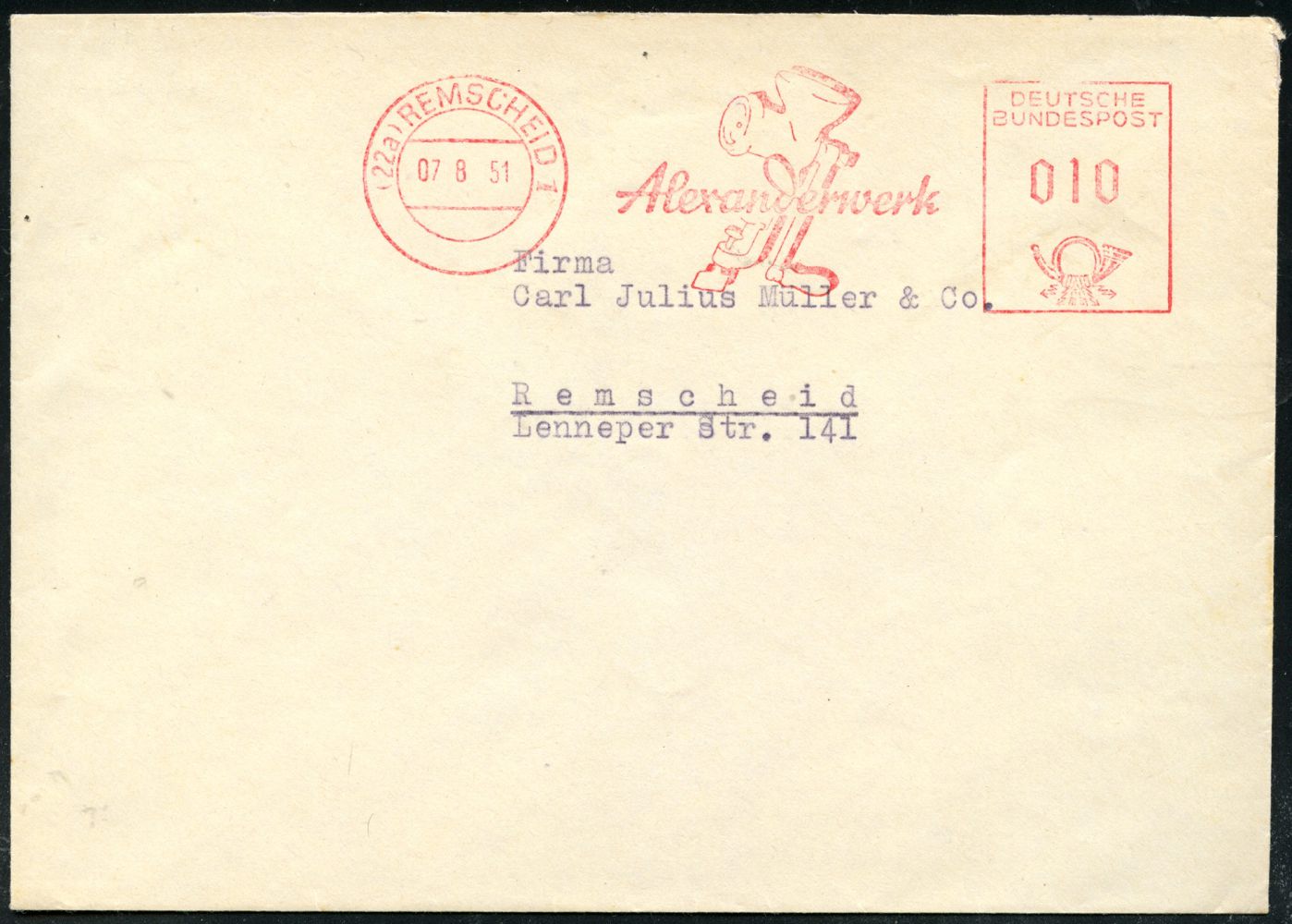 10363 | 16 € | 5630 REMSCHEID : (22a) REMSCHEID 1/ Alexanderwerk 1951 (7.8.) AFS Francotyp = Fleischwolf , rs. Abs.-Vordruck mit Hinweis: Britische Zone (seit 1949 nicht mehr existen1), Fern-Bf., seltenes Motiv! (Dü.E-20CGo) | ![]() ![]() | |