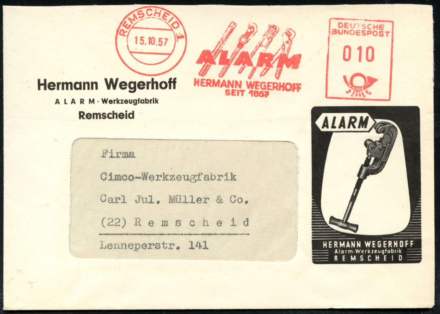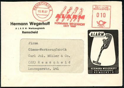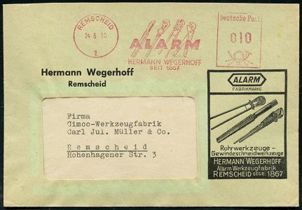 10357 | 18 € | 5630 REMSCHEID : REMSCHEID/ 1/ ALARM/ HERMANN WEGERHOFF/ SEIT 1867 1950 (24.6.) AFS Francotyp "Posthorn" (Motiv: 4 Spezial-Zangen) auf motv-ähnl. Reklame-Bf.: "ALARM" FABRIKATE.. (Dü.E-20CEo) | ![]() | |