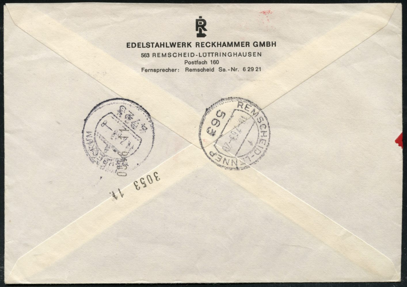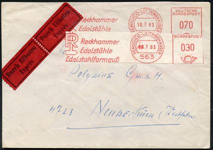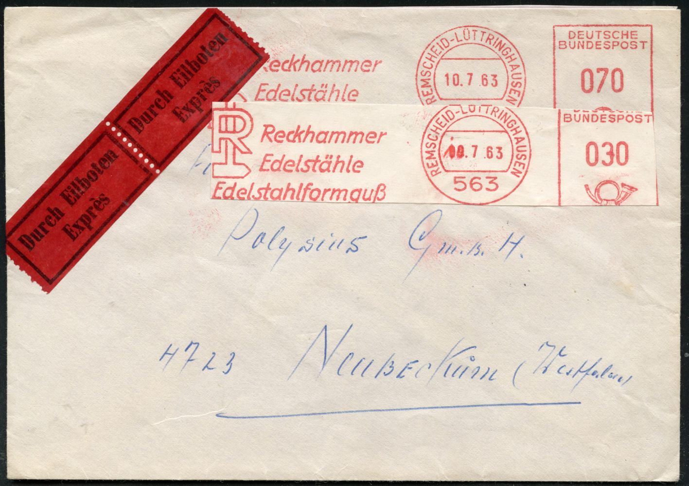 10394 | 18 € | 5630 REMSCHEID : 563 REMSCHEID-LÜTTRINGHAUSEN/ Reckhammer/ Edelstähle/ Edelstahlfromguß 1963 (10.7.) AFS Francotyp 070 Pf. + 030 Pf. nachgeklebt mit hs. Datumskorrektur = postalisch unzulässig! , rs. Abs.-Vordruck, unbeanstandeter Fern-Eil-Bf. n. Neubeckum, rs. div. TS/AS, Unikat-Beleg! (Dü.E-26) | ![]() ![]() | |