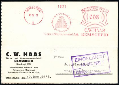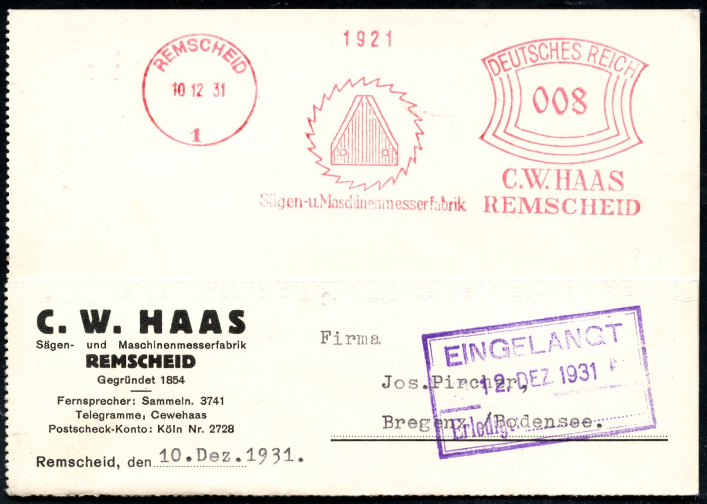 10310 | 25 € | 5630 REMSCHEID : REMSCHEID/ 1/ Sägen-u.Maschinenmesserfabrik/ C.W.HAAS 1931 (10.12.) AFS Francotyp "Bogenrechteck" 008 Pf. (Sägeblatt, Maschinenmesser) klar gest. Ausl.-Firmen-Kt. n. Bregenz = Inl.-Tarif ! (Dü.E-1CEh) | ![]() | |