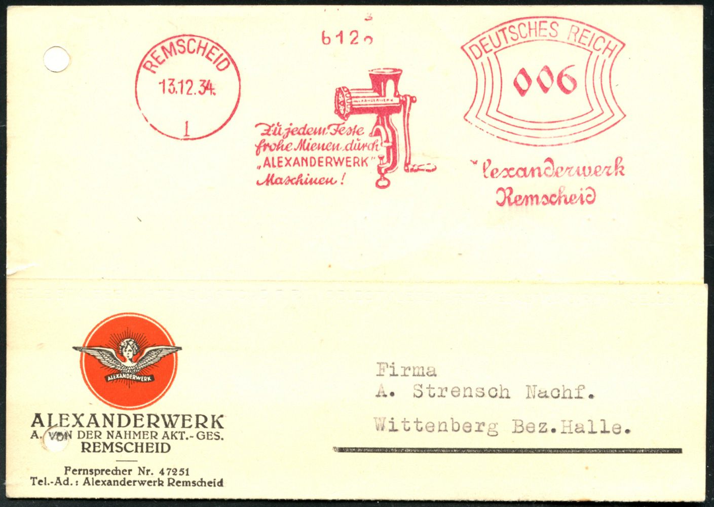 10318 | 18 € | 5630 REMSCHEID : REMSCHEID/ 1/ Zu jedem Feste../ "ALEXANDERWERK"/ Maschinen!/ Aleanderwerk 1934 (13.12.) AFS Francotyp "Bogenrechteck" (Motiv: Fleischwolf) dekorative, zweifarbiger Firmenkt. (Reg.-Lochung geschl.) mit Firmenlogo (Dü.E-1BAh) | ![]() | |