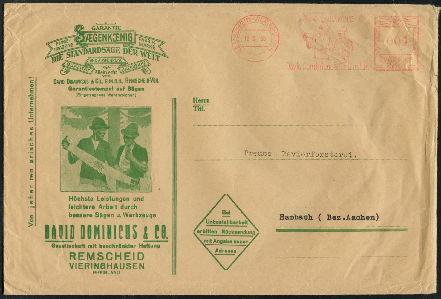 10324 | 20 € | 5630 REMSCHEID : REMSCHEID-VIERINGHAUSEN/ Marke Sägenkönig/ David Dominicus.. 1936 (16.9.) AFS Francotyp "Hakenkreuz" (2 Männer begutachten große Handsäge) großer, motivgl. Reklame-Bf. (Format A5, leichte Knitter) dekorativ! (Dü.E-3CEo) | ![]() | |