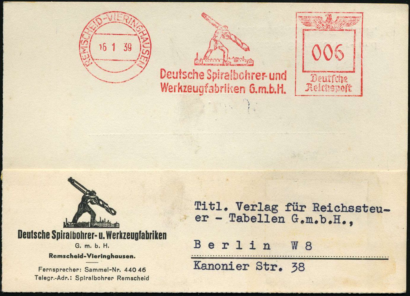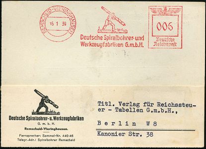 10337 | 25 € | 5630 REMSCHEID : REMSCHEID-VIERINGHAUSEN/ Deutsche Spriralbohrer-u./ Werkzeugfabriken GmbH 1939 (16.1.) AFS Francotyp "Reichsadler" (Motiv: Titan mit Riesenbohrer über der Stadt) motivgl., dekorative Firmenkt. (Dü.E-5CEo) | ![]() | |