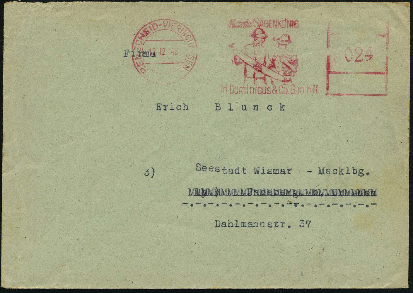 10345 | 25 € | 5630 REMSCHEID : REMSCHEID-VIERINGHAUSEN/ Marke Sägenkönig/ David Dominicus.. 1946 (12.12.) aptierter AFS Francotyp "Hakenkreuz" = entfernt = Notmaßnahme! (2 Männer begutachten gr. Handsäge) zeitbedingt etw. abgenutzt, rs. Abs.-Vordruck (Klappenriß) Fern-Bf. in die SBZ (Dü.E-12 AK-98o) | ![]() | |