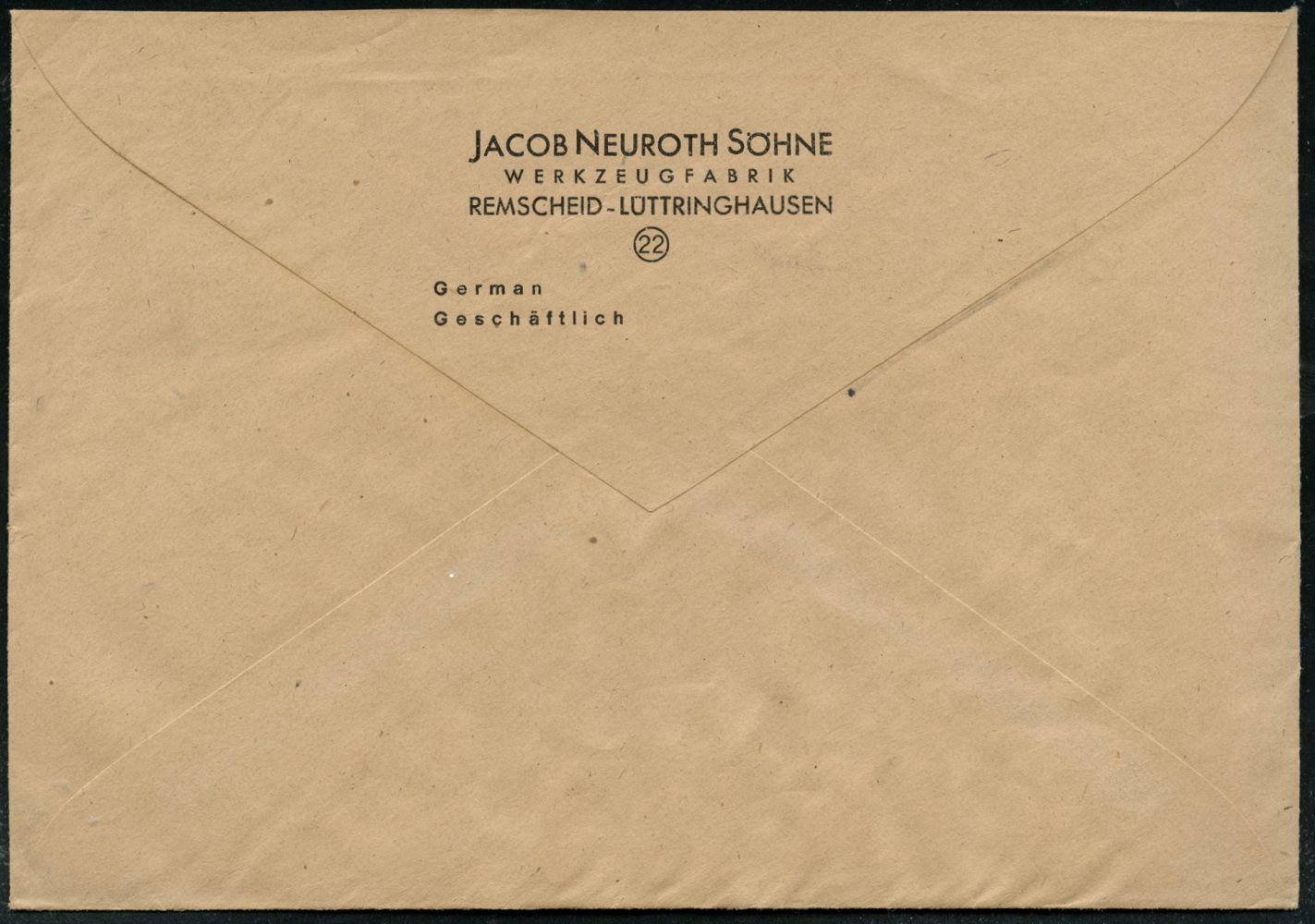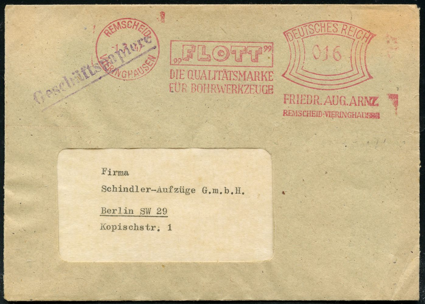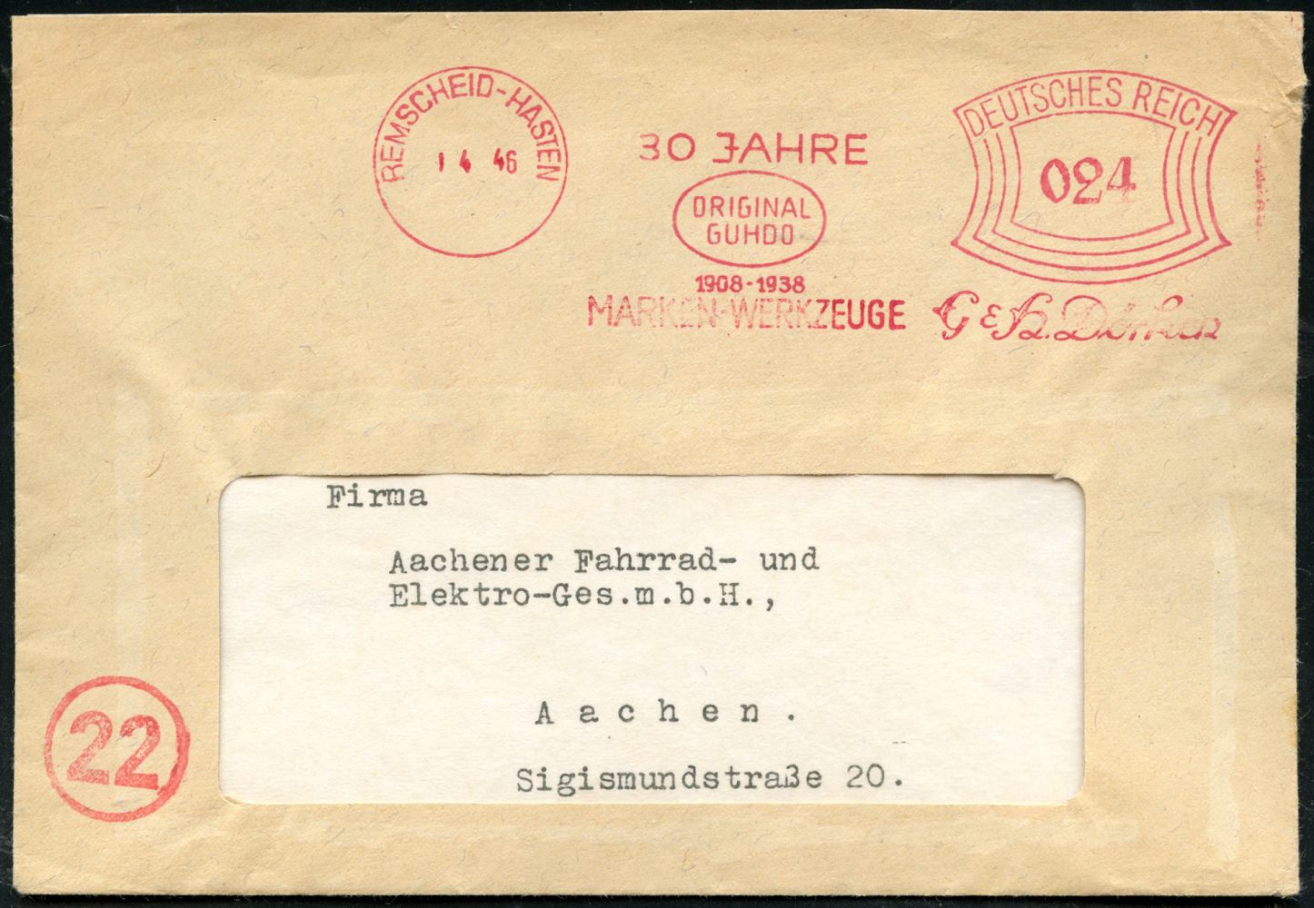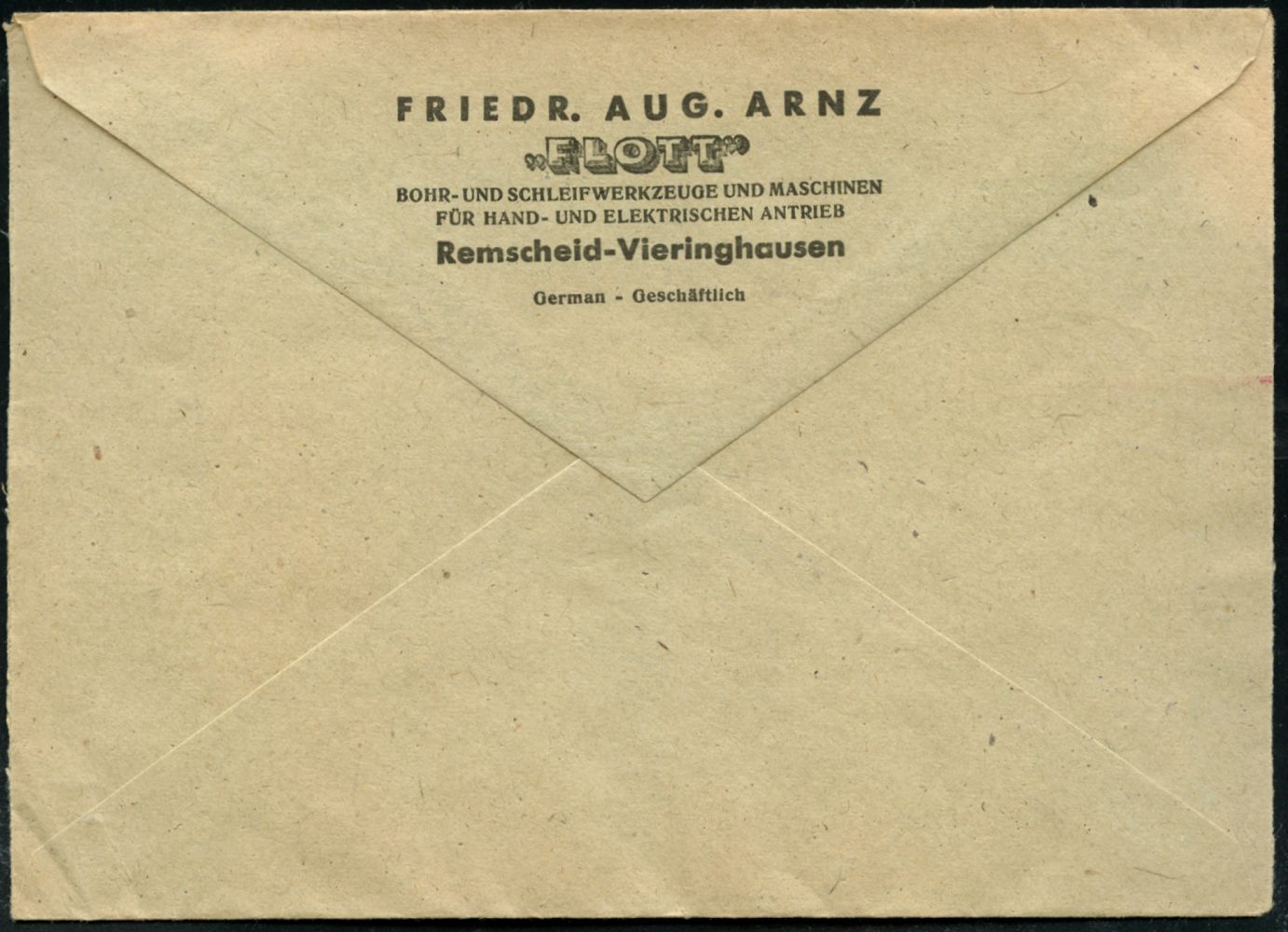 10346 | 25 € | 5630 REMSCHEID : REMSCHEID-/ VIERINGHAUSEN/ "FLOTT"/ DIE QUALITÄTSMARKE/ FÜR BOHRWERKZEUGE/ FRIEDR.AUG.ARNZ.. 1947 (1.7.) AFS Francotyp Bogenrechteck "DETSCHES REICH" u n v e r ä n d e r t weiterverwendet = Notmaßnahme! , rs. Abs.-Vordruck: FRIEDR. AUG. ARNZ, "FLOTT", BOHR- U. SCHLEIFWERKZEUGE U. MASCHINEN.., Fern-Bf. (Dü.E-1CEo, unverändert) | ![]() ![]() | |