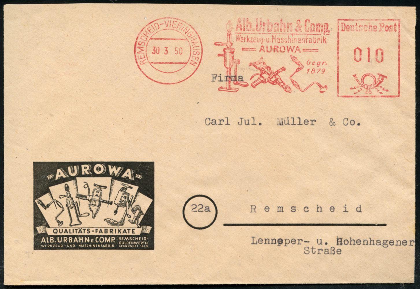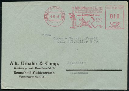 10353 | 16 € | 5630 REMSCHEID : REMSCHEID-VIERINGHAUSEN/ Alb.Urbahn & Comp./ Werkzeug-u.Maschinenfabrik/ AUROWA/ Gegr.1879 1949 (8.10.) AFS Francotyp "Posthorn" (Motive: 2 Hand-, 1 Elektro-Bohrmaschine, 1 Fleischwolf) dekorativer Firmen-Bf., viele Motive! (Dü.E-20CG) | ![]() | |
