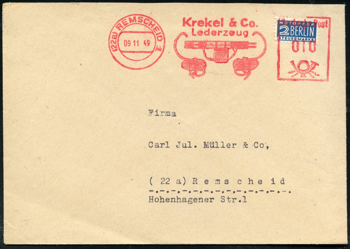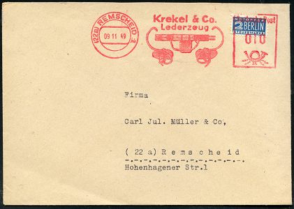 10354 | 18 € | 5630 REMSCHEID : (22a) REMSCHEID 1/ Krekel & Co/ Lederzeug 1949 (9.11.) AFS Francotyp "Posthorn" (Motiv: Leder-Gürtel u.-Steigeisen für Telegrafen-Arbeiter!) auf 2 Pf. NoB (= Vorausentwertung), Orts-Bf., sehr seltenes Motiv! (Dü.E-20CG) | ![]() | |