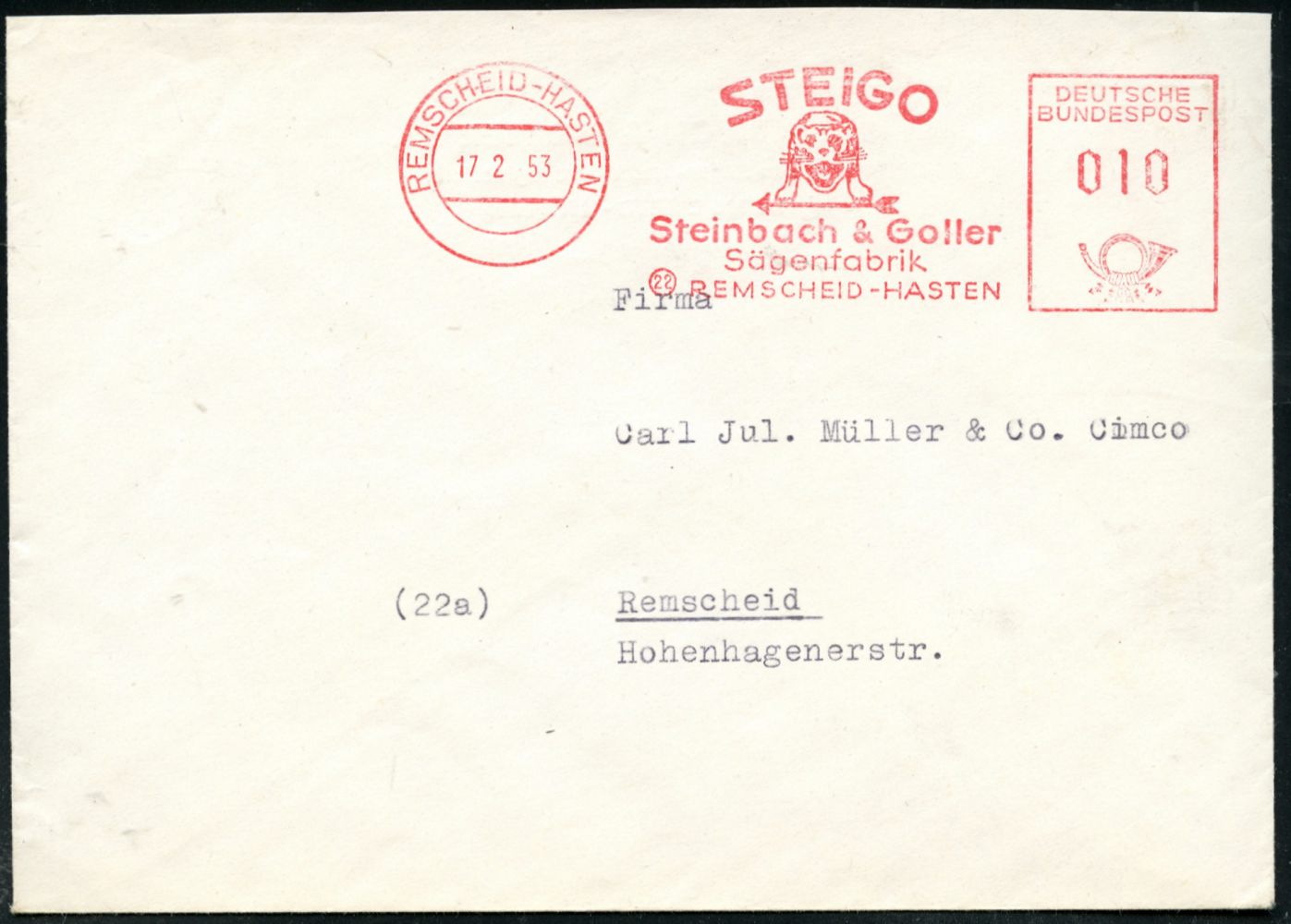 10371 | 18 € | 5630 REMSCHEID : REMSCHEID-HASTEN/ STEiGO/ Steinbach & Goller/ Sägenfabrik.. 1953 (17.2.) AFS Francotyp ohne PLZ = fauchende Wildkatze (Firmenlogo) , rs. Abs.-Vordruck, Orts-Bf., seltenes u. beliebtes Motiv! (Dü.E-23CG) | ![]() | |