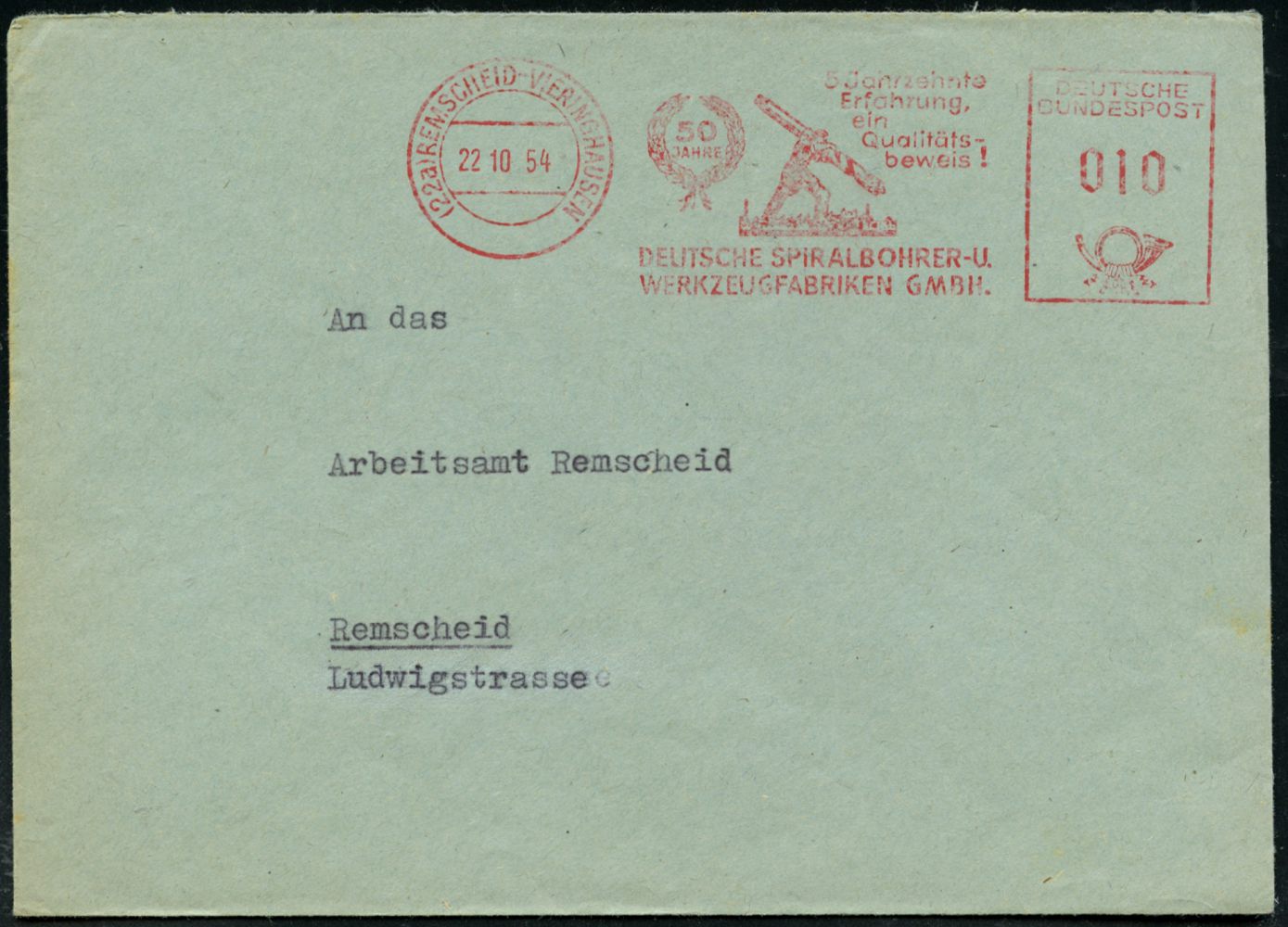 10374 | 18 € | 5630 REMSCHEID : (22a) REMSCHEID-VIERINGHAUSEN/ 50 JAHRE/ DEUTSCHE SPRIALBOHRER-U./ WERZEUGFABRIKEN GMBH 1954 (22.10.) Jubil.-AFS Francotyp (Motiv: Titan mit Riesenboher Remscheid) rs. Abs.-Vordrucl, Orts-Bf., vergl. Kat.-Nr. 10337 (Dü.E-23CGo) | ![]() | |