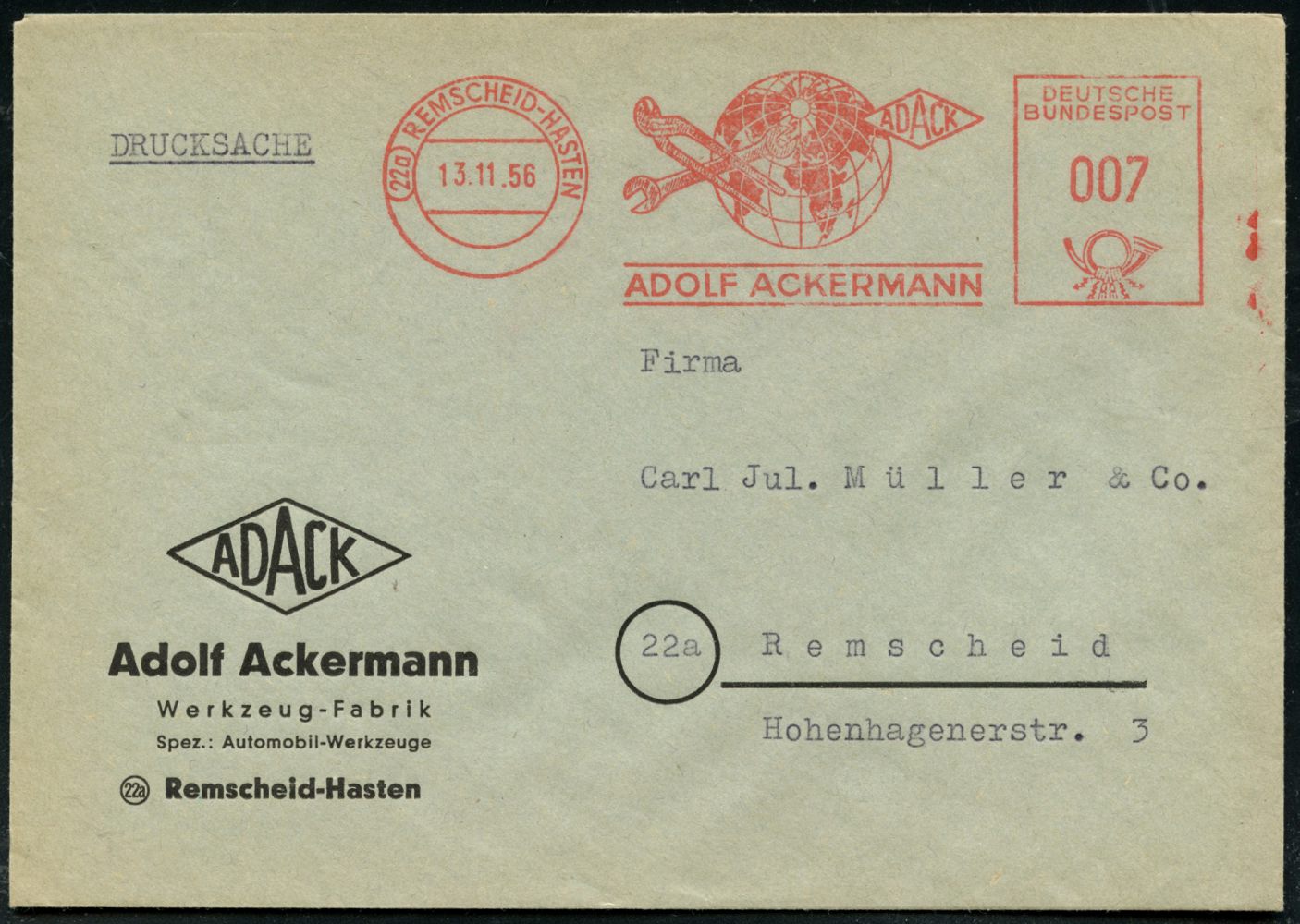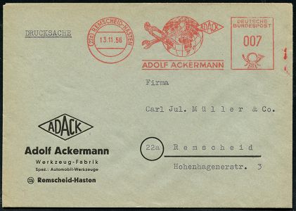 10376 | 16 € | 5630 REMSCHEID : (22a) REMSCHEID-HASTEN/ ADACK/ ADOLF ACKERMANN 1956 (13.11.) AFS Francotyp (Motive: Rohrzange, Schraubenschlüssel, Globus mit Nordpol) klar gest. Firmen-Orts-Bf. (Dü.E-23CO) | ![]() | |