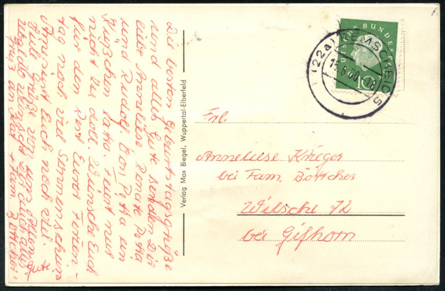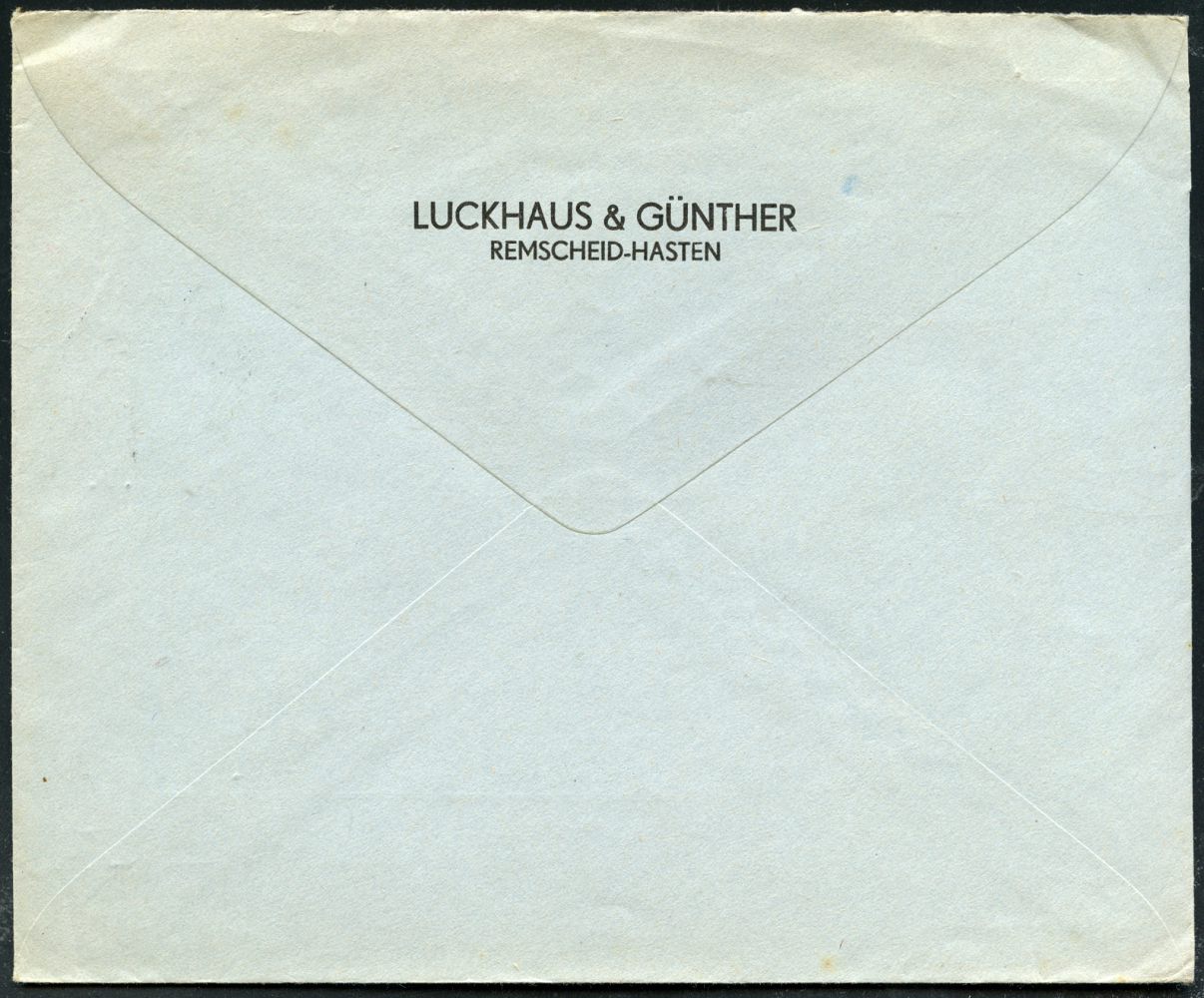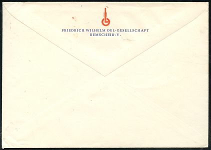 10373 | 8 € | 5630 REMSCHEID : (22a) REMSCHEID 1/ a/ DEUTSCHE/ BUNDESPOST 1954 (19.5.) PFS "Achteck Posthorn" 4 (Pf.) , rs. zweifarbiger Abs.-Vordruck: FRIEDRIH WILHELM OEL-GESELLSCHAFT (Logo), Orts-Bf. (Dü.D-16, Nr.272) | ![]() ![]() | |