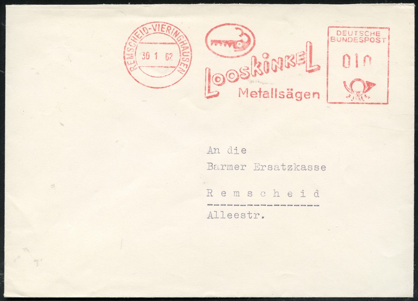 10390 | 15 € | 5630 REMSCHEID : REMSCHEIDE-VIERRINGHAUSEN/ LOOSKINKEL/ Metallsägen 1962 (30.1.) AFS Francotyp = Sägefisch (Firmenlogo), rs. Abs.-Vordruck, Orts-Bf., seltenes Motiv! (Dü.E-23CG) | ![]() | |