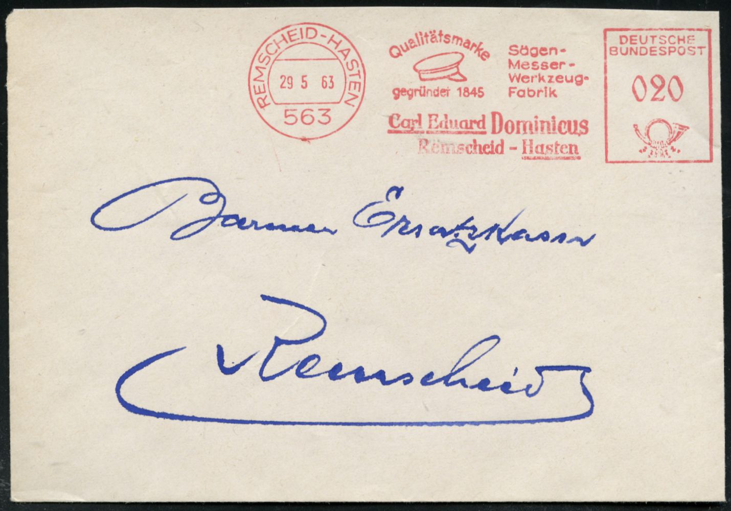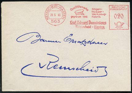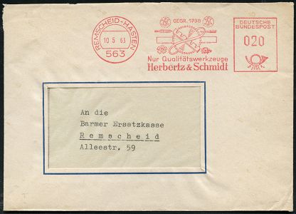 10391 | 15 € | 5630 REMSCHEID : 563 REMSCHEID-HASTEN/ GEGR.1798/ ..Herbertz & Schmidt 1963 (10.5.) AFS Francotyp (Motive: Band- u.Kreissägeblätter etc.) rs. Abs.-Vordruck, Orts-Bf. (Dü.E-23CGo) | ![]() | |