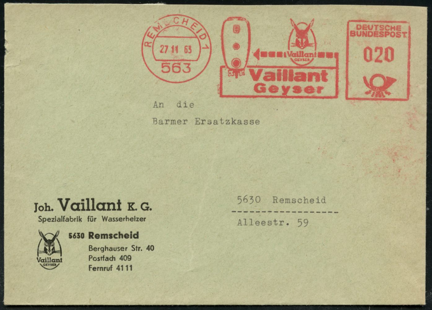 10395 | 15 € | 5630 REMSCHEID : 563 REMSCHEID 1/ Vaillant/ Geyser 1963 (10.5.) AFS Francotyp (Motive: Heiwasser-Boiler, Hasenkopf = Firmenlogo) motivähnl. Firmenbf. (Dü.E-23CG) | ![]() | |