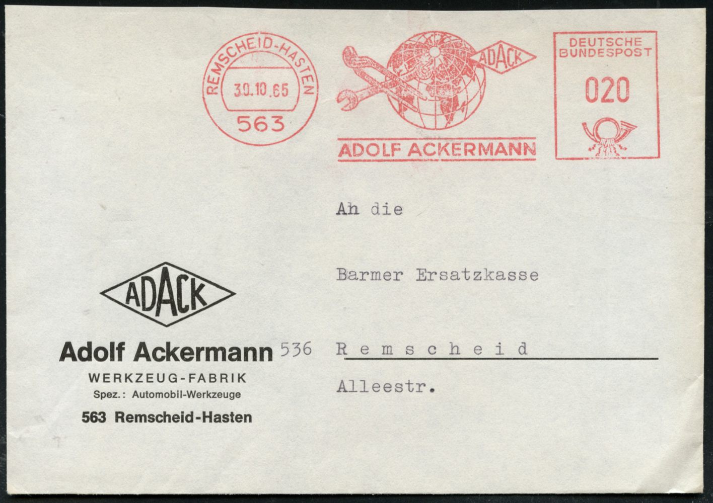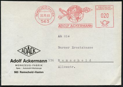 10400 | 15 € | 5630 REMSCHEID : 563 REMSCHEID-HASTEN/ ADACK/ ADOLF ACKERMANN 1965 (30.10.) AFS Francotyp (Motive: Rohrzange, Schraubschlüssel, Globus mit Nordpol) klar gest. Firmen-Bf. (Dü.E-23CO) | ![]() | |