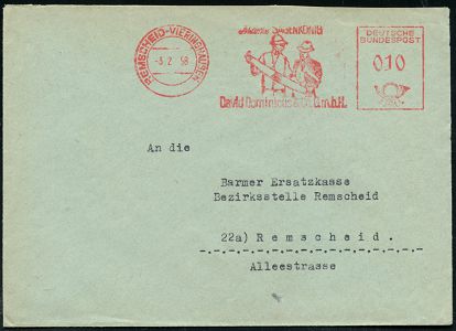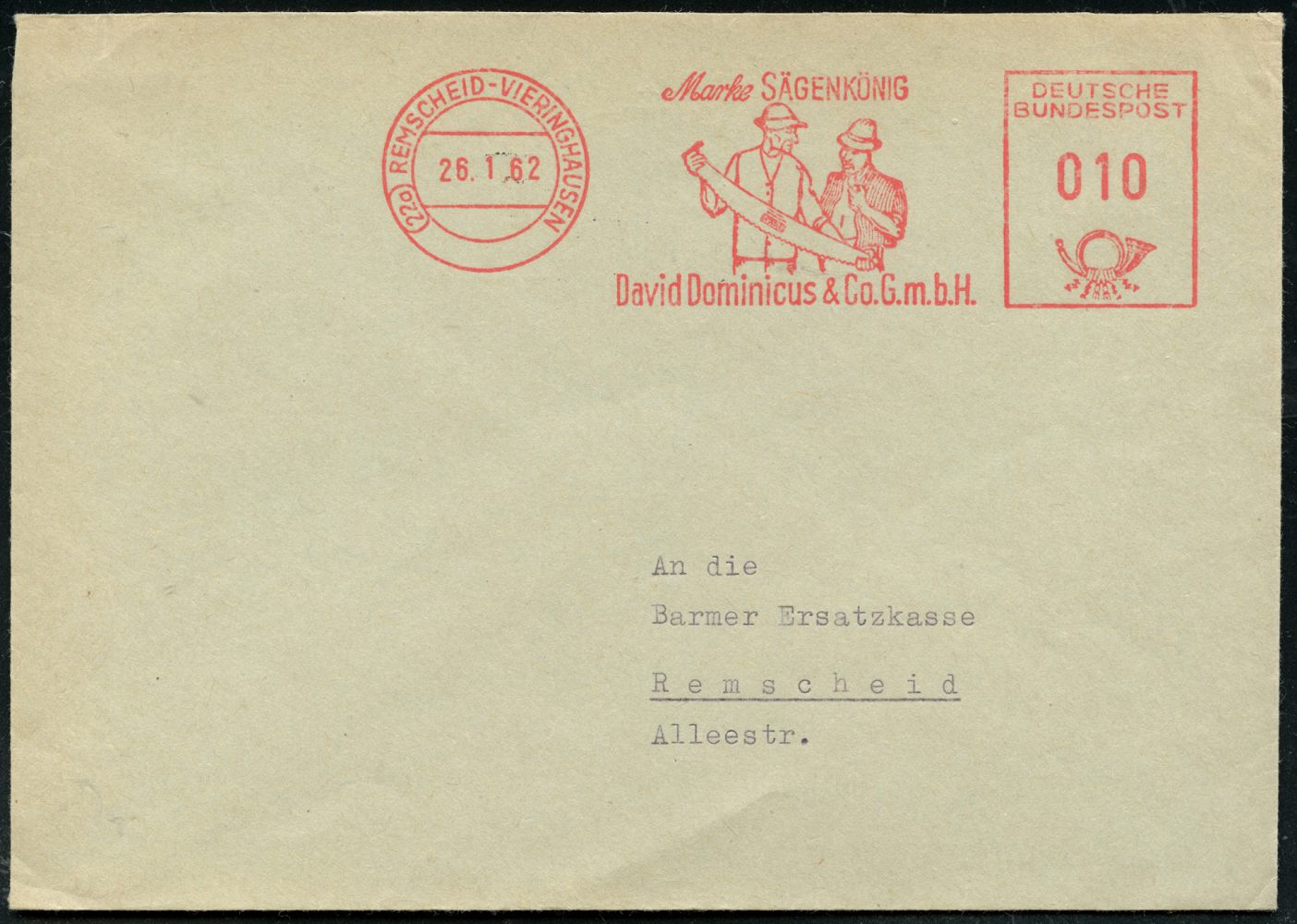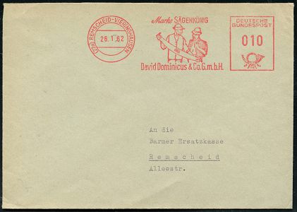 10380 | 25 € | 5630 REMSCHEID : REMSCHEID-VIERRINGHAUSEN/ Marke SÄGENKÖNIG/ D.Dominicus & Co.. 1958/62 2 verschiedene AFS Francotyp, 1x ohne PLZ, 1x mit PLZ, Neugravur von Stempel, Klischee und Wertrahmen! (je Motiv: 2 Männer mit Hut prüfen Sägeblatt) je rs. Abs.-Vordruck: DAVID DOMINICUS & CO.. (Einzelverkauf möglich: je 15.- EUR), 2 Belege (Dü.E-23CE, E-23CO) | ![]() ![]() | |