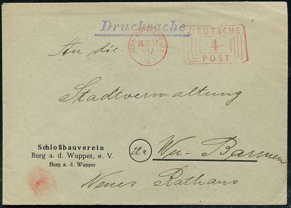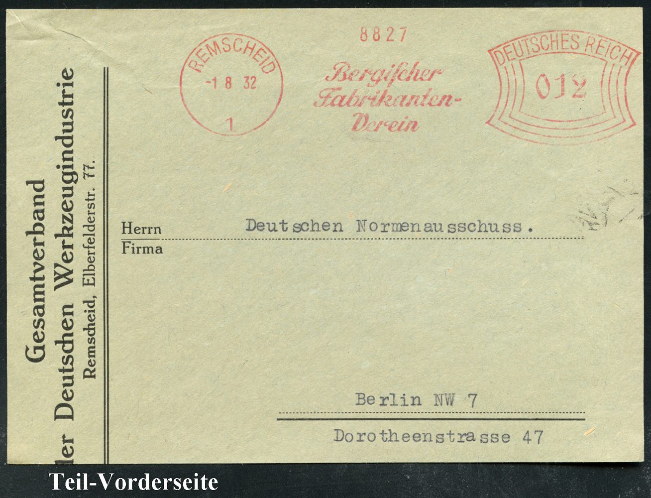10313 | 15 € | 5630 REMSCHEID : REMSCHEID/ 1/ Bergischer/ Fabrikanten-/ Verein 1932 (1.8.) AFS Francotyp "Bogenrechteck" auf Teil-Vorderseite; Gesamtverband der Deutschen Werkzeugindustrie (Dü.E-1CEh) | ![]() | |