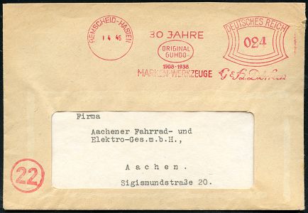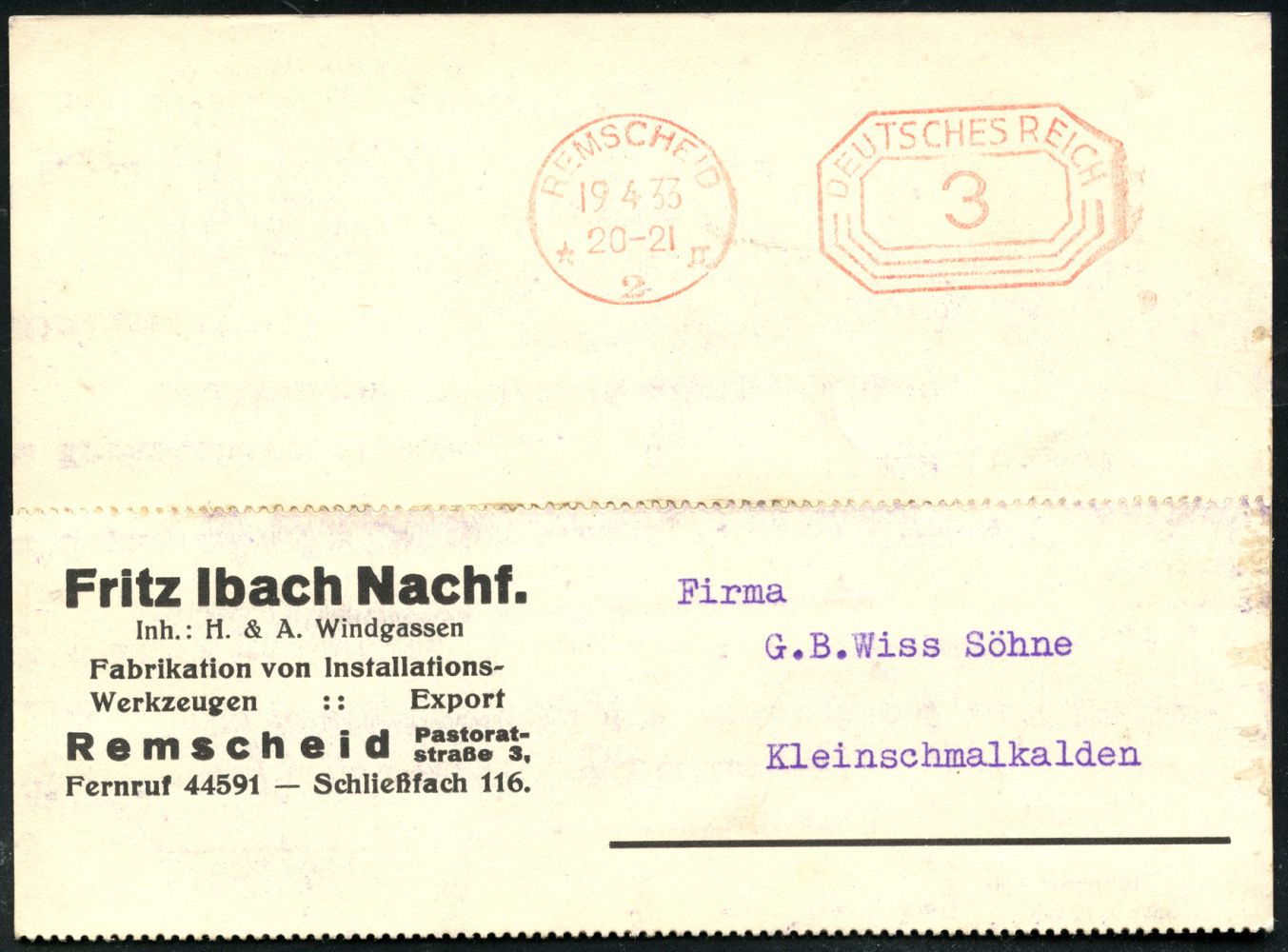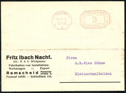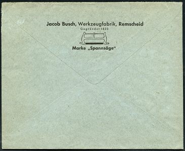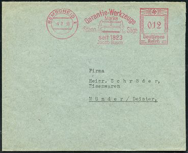 10334 | 25 € | 5630 REMSCHEID : REMSCHEID 1/ Garantie-Werkzeuge/ ..Jacob Busch 1938 (4.7.) AFS Francotyp "Hakenkreuz" (Motiv: Hand-Spann-Säge) rs. motivgl. Abs.-Vordruck, Fern-Bf. (Dü.E-3CEo) | ![]() ![]() | |
