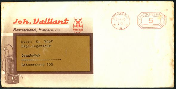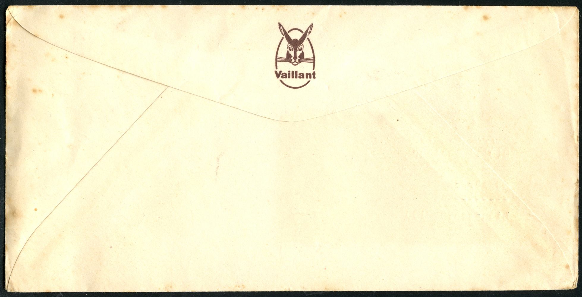 10315 | 15 € | 5630 REMSCHEID : REMSCHEID/ * 1 II/ DEUTSCHES REICH 1933 (21.4.) PFS "Achteck" auf Reklame-Bf.: Joh. Vaillant.. mit Warmwasser-Apparat (Logo: Hasenkopf) Inl.-Bf. (Rand etw. stockig), vergl. Kat.-Nr. (Dü.D-4) | ![]() ![]() ![]() | |