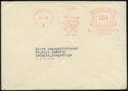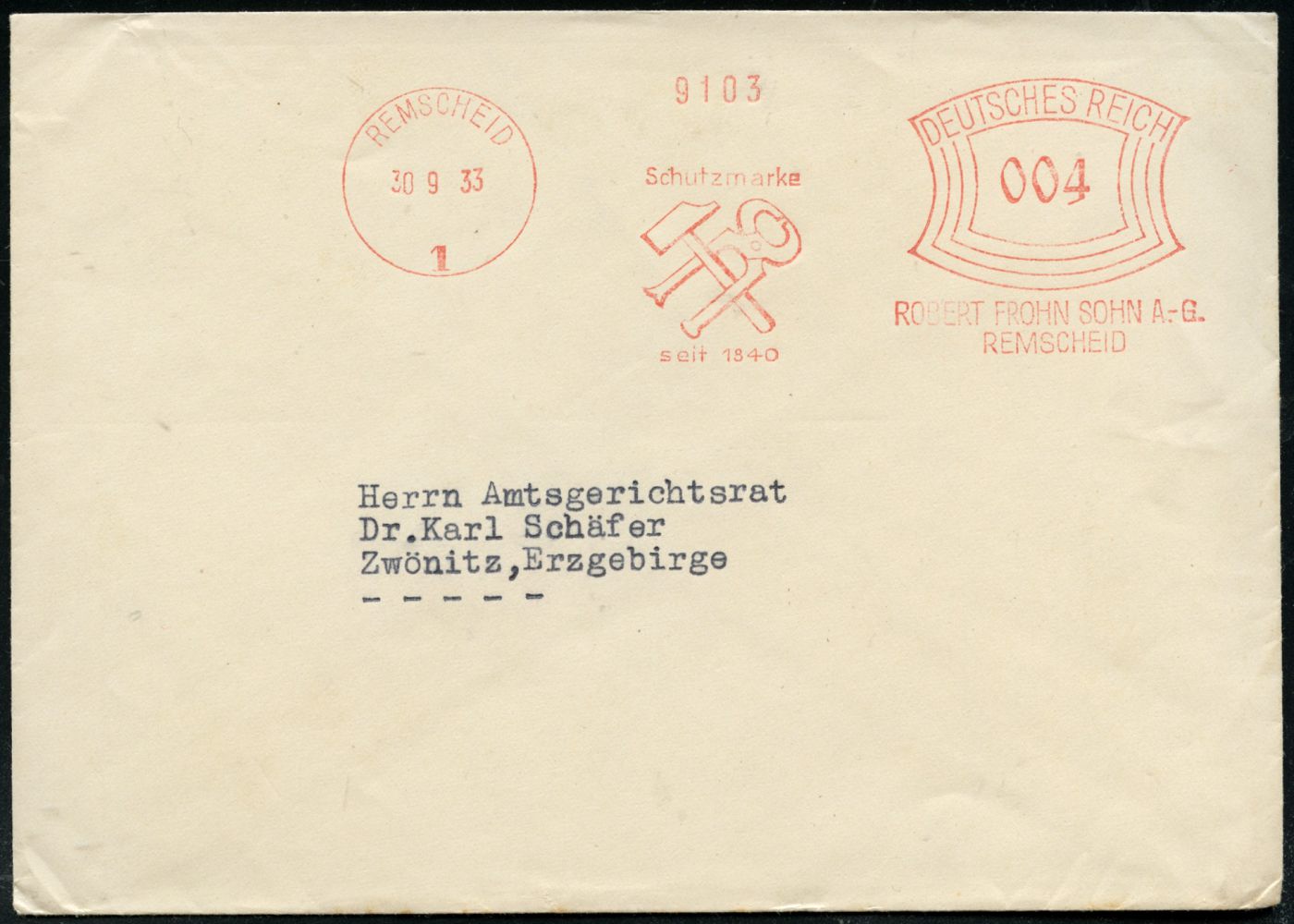10316 | 20 € | 5630 REMSCHEID : REMSCHEID/ 1/ Schutzmarke/ seit 1840/ ROBERT FROHN SOHN A.-G.. 1933 (30.9.) AFS Francotyp "Bogenrechteck" (Hammer u. Kneifzange) Fern-Bf. (Dü.E-1CEh) | ![]() | |