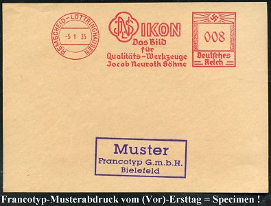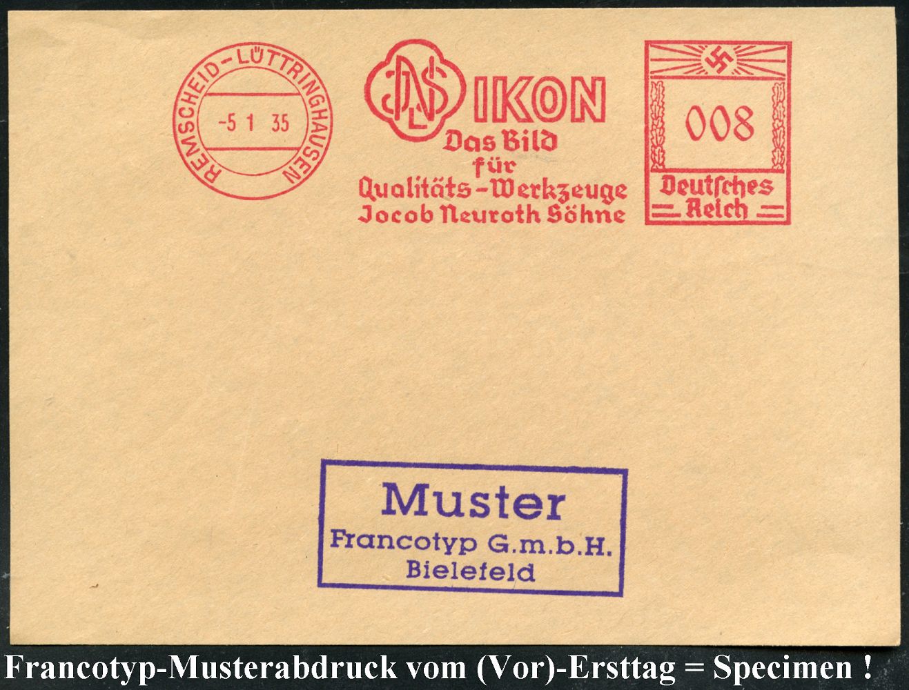 10319 | 35 € | 5630 REMSCHEID : REMSCHEID-LÜTTRINGHAUSEN/ ..IKON/ Das Bild/ für/ Qualitäts-Werkzeuge/ Jocob Neurath Söhne 1935 (5.1.) AFS-Musterabdruck Francotyp "Hakenkreuz" (Monogr.-Logo) glasklar gest. Francotyp-Musterblatt vom (Vor)-Ersttag !, selten! (Dü.E-3CEo) | ![]() ![]() | |