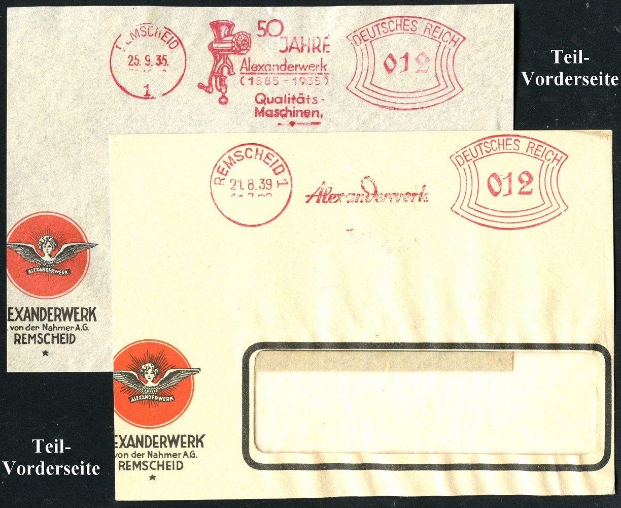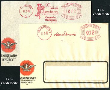 10323 | 25 € | 5630 REMSCHEID : REMSCHEID 1/ Alexanderwerk.. 1935/39 2 verschiedene AFS Francotyp "Bogenrechteck", 1x Jubil.-AFS "50 JAHRE Alexanderwerk.." (Fleischwolf) je auf Teil-Vorderseite, 2 Belege (Dü.E-1BAo) | ![]() | |