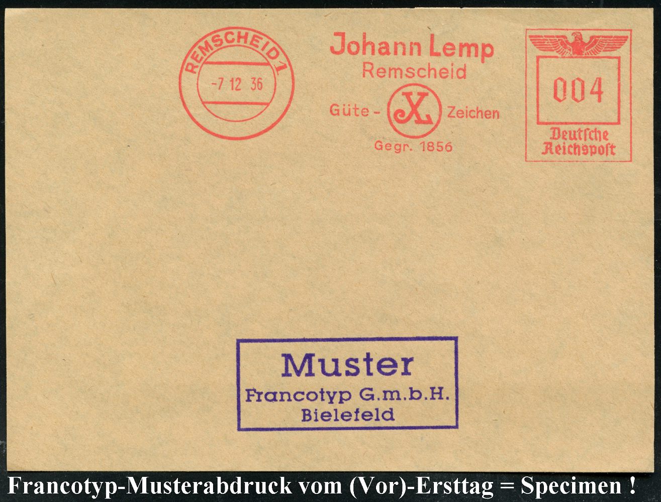 10325 | 35 € | 5630 REMSCHEID : REMSCHEID 1/ Johann Lemp/ ..Güte-Zeichen/ Gegr.1856 1936 (7.12.) AFS-Musterabdruck Francotyp "Reichsadler" (Monogr.-Logo) glasklar gest. Francotyp-Musterblatt vom (Vor)-Ersttag !, selten! (Dü.E-5CGo) | ![]() ![]() | |