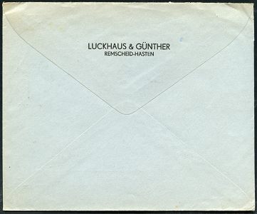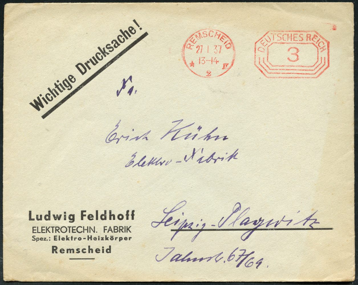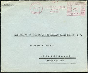10326 | 20 € | 5630 REMSCHEID : REMSCHEID-/ HASTEN/ LUCKHAUS & GÜNTHER/ EXPORT/ GEGR.1834 1937 (9.1.) AFS Francotyp "Mäanderrechteck" 025 Pf. , rs. Abs.-Vordruck, Ausl.-Bf. n. Amsterdam (Dü.E-2CEh) | ![]() ![]() | |