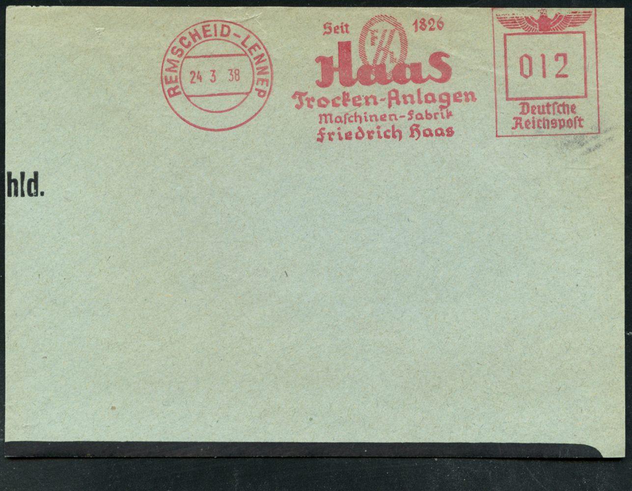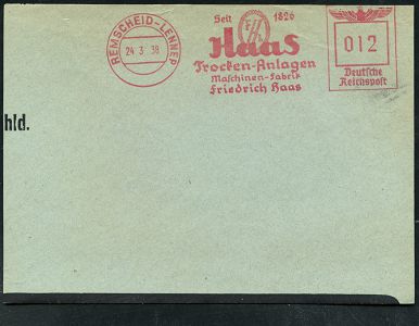 10333 | 12 € | 5630 REMSCHEID : REMSCHEID-LENNEP/ Seit 1826/ Haas/ Trocken-Anlagen/ Maschinen-Fabrik/ Friedrich Haas 1938 (24.3.) AFS Francotyp "Reichsadler" (Monogr.-Logo) auf Briefstück (Dü.E-5CGo) | ![]() | |