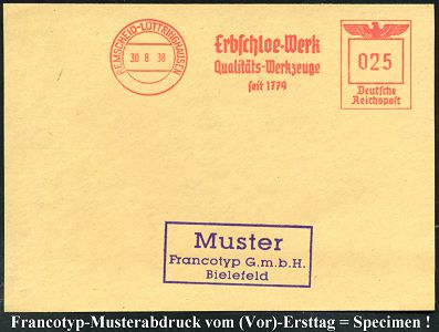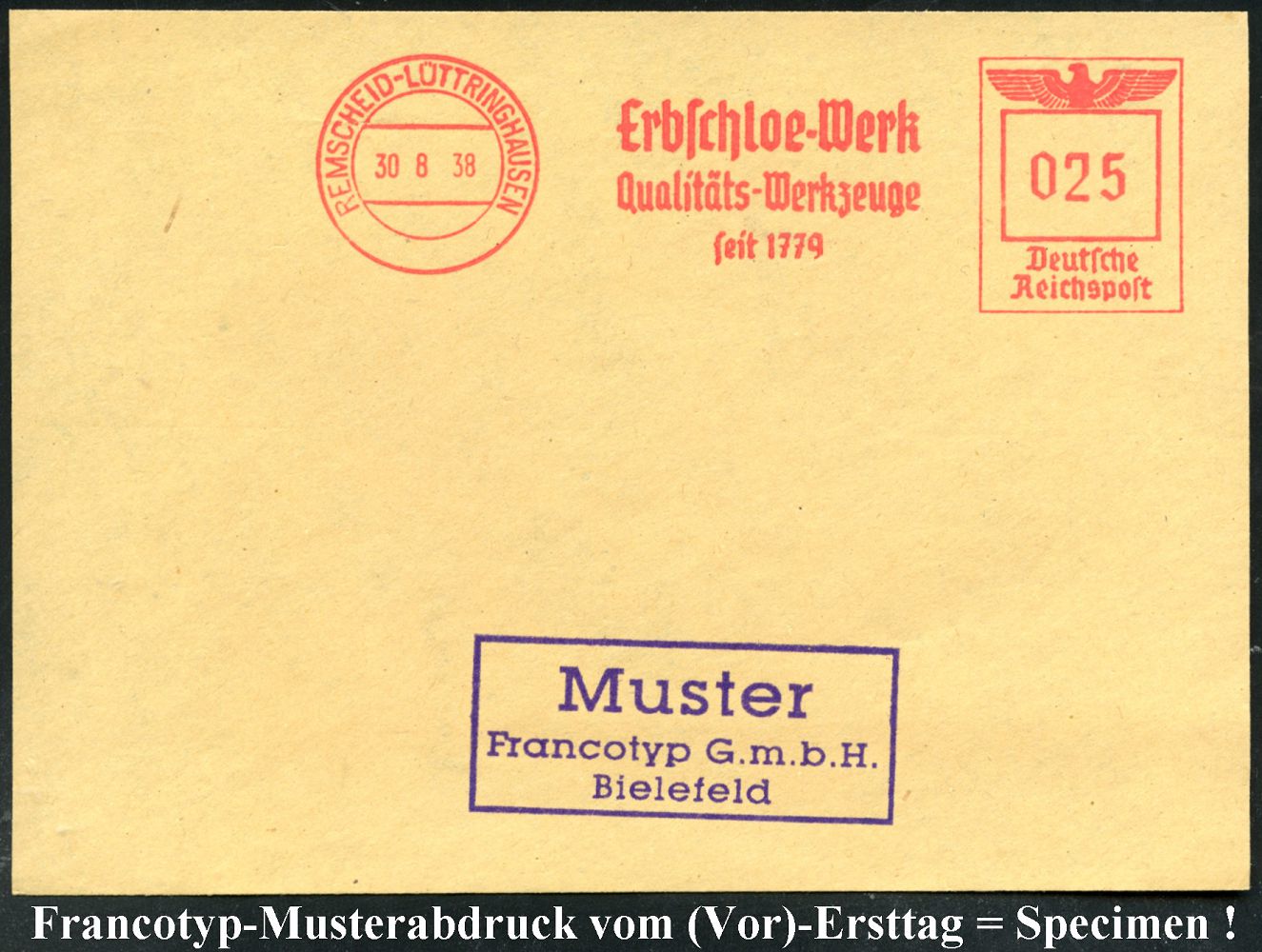 10335 | 35 € | 5630 REMSCHEID : REMSCHEID-LÜTTRINGHAUSEN/ Erbschloe-Werk/ Qualitäts-Werkzeuge/ seit 1779 1938 (30.8.) AFS-Musterabdruck Francotyp "Reichsadler" , glasklar gest. Francotyp-Musterblatt vom (Vor)-Ersttag !, selten! (Dü.E-5CGo) | ![]() ![]() | |