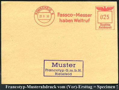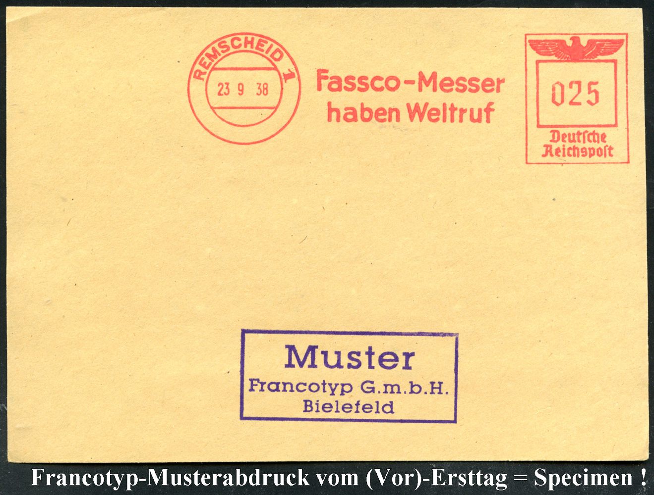 10336 | 35 € | 5630 REMSCHEID : REMSCHEID 1/ Fassco-Messer/ haben Weltruf 1938 (23.9.) AFS-Musterabdruck Francotyp "Reichsadler" , glasklar gest. Francotyp-Musterblatt vom (Vor)-Ersttag !, selten! (Dü.E-5CGo) | ![]() ![]() | |