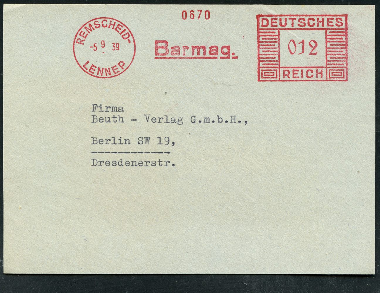 10338 | 14 € | 5630 REMSCHEID : REMSCHEID-/ LENNEP/ Barmag. 1939 (5.9.) AFS Francotyp "Mäanderrechteck" klar auf Bedarfs-Vorderseite (Dü.E-2CEh) | ![]() | |