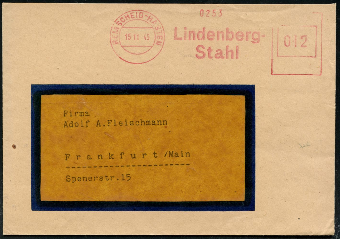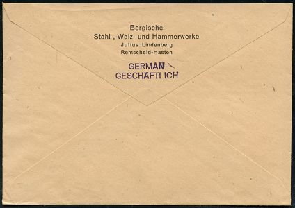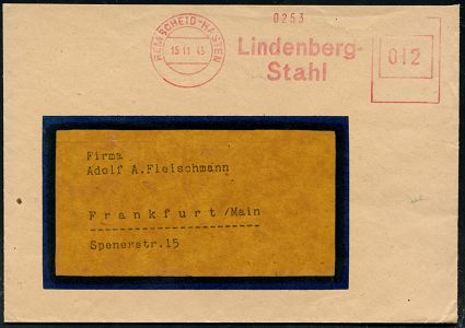 10342 | 25 € | 5630 REMSCHEID : REMSCHEID-HASTEN/ Lindenberg-/ Stahl 1945 (15.11.) aptierter AFS Francotyp "Reichsadler" = entfernt = Notmaßnahme! , rs. Abs.-Vordruck: Bergische Stahl-, Walz- u. Hammerwerke, Julius Lindenberg.., Fern-Bf. (Dü.E-13 AK-129h) | ![]() ![]() | |