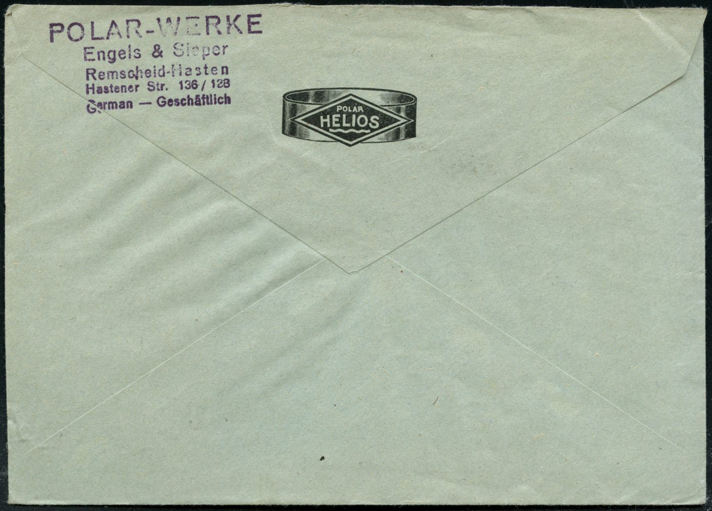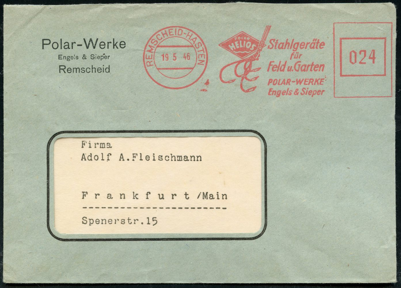 10344 | 25 € | 5630 REMSCHEID : REMSCHEID-HASTEN/ ..HELIOS/ Stahlgeräte/ für Feld u.Garten/ POLAR-WERKE/ Engels & Sieper 1946 (19.5.) aptierter AFS Francotyp "Reichsadler" = entfernt = Notmaßnahme! (Motiv: Harke) rs. Firmen-Logo (Stahlband) Fern-Bf. (Dü.E-5CGo) | ![]() ![]() | |